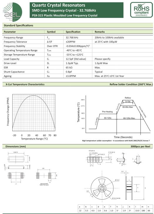 AEL晶振,PSX-315晶振,32.768KHZ晶振,貼片表晶32.768K系列具有超小型,薄型,質地輕的表面貼片音叉型石英晶體振蕩器,晶振產品本身具備優良的耐熱性,耐環境特性,在辦公自動化,家電領域,移動通信領域可發揮優良的電氣特性,符合無鉛標準,滿足無鉛焊接的回流溫度曲線要求,金屬外殼的石英晶振使得產品在封裝時能發揮比陶瓷晶振外殼更好的耐沖擊性能.