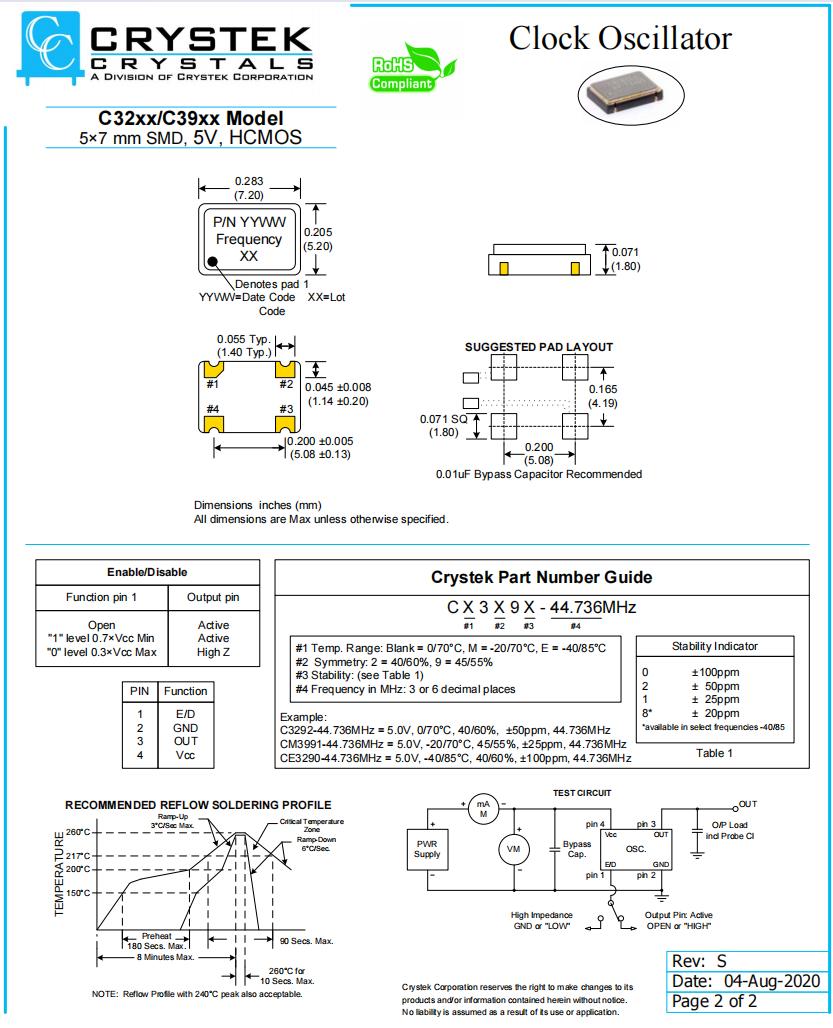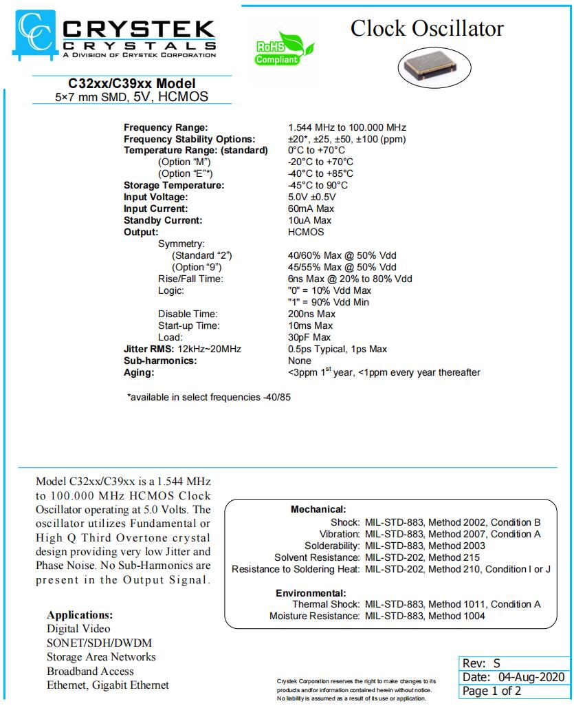 | C3290-100.000 | Crystek晶振 | C3290 | 100MHz | ±100ppm |