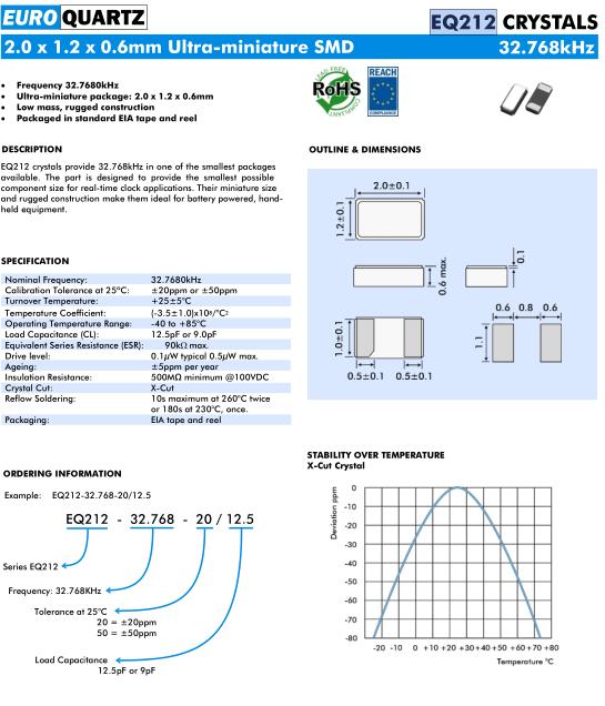 Euroquartz晶振,EQ212晶振,Q212-32.768-20/12.5晶振,32.768K時鐘晶體具有小型,薄型,輕型的貼片晶振表面音叉型晶體振蕩器,產(chǎn)品具有優(yōu)良的耐熱性,耐環(huán)境特性,可發(fā)揮晶振優(yōu)良的電氣特性,符合RoHS規(guī)定,滿足無鉛焊接的高溫回流溫度曲線要求,金屬外殼的封裝使得產(chǎn)品在封裝時能發(fā)揮比陶瓷振蕩器外殼更好的耐沖擊性.