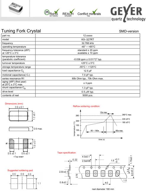 Geyer晶振,KX-327RT晶振,2012mm無(wú)源晶振,貼片表晶32.768K系列具有超小型,薄型,質(zhì)地輕的表面貼片音叉型石英晶體振蕩器,晶振產(chǎn)品本身具備優(yōu)良的耐熱性,耐環(huán)境特性,在辦公自動(dòng)化,家電領(lǐng)域,移動(dòng)通信領(lǐng)域可發(fā)揮優(yōu)良的電氣特性,符合無(wú)鉛標(biāo)準(zhǔn),滿(mǎn)足無(wú)鉛焊接的回流溫度曲線(xiàn)要求,金屬外殼的石英晶振使得產(chǎn)品在封裝時(shí)能發(fā)揮比陶瓷晶振外殼更好的耐沖擊性能.