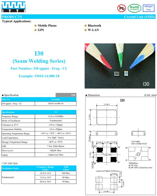 ITTI晶振,I30晶振,I3010-12.000-18晶振,超小型表面貼片型SMD晶振,最適合使用在汽車電子領域中,也是特別要求高可靠性的引擎控制用CPU的時鐘部分.低頻晶振可從7.98MHz起對應,小型,超薄型具備強防焊裂性,石英晶體在極端嚴酷的環境條件下也能發揮穩定的起振特性,產品本身具有耐熱,耐振,耐撞擊等優良的耐環境特性,滿足無鉛焊接以及高溫回流溫度曲線要求,符合AEC-Q200標準.