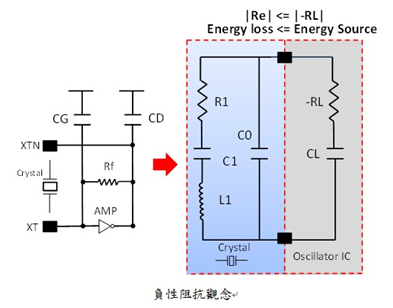 石英晶體共振子的兩端往振蕩電路看過(guò)去,排除共振子以外的所有阻抗特性質(zhì)總和,振蕩電路上必須提供足夠大的增益來(lái)補(bǔ)償共振子共振時(shí)的機(jī)械能損耗,也就是放大器為一個(gè)能量源,若負(fù)性阻抗的能量源大于振蕩電路的損耗時(shí),能源回路為平衡狀態(tài)此回路為穩(wěn)定振蕩,負(fù)性阻抗不是產(chǎn)品規(guī)格參數(shù),但卻是振蕩線路設(shè)計(jì)時(shí)很重要的性能指針.