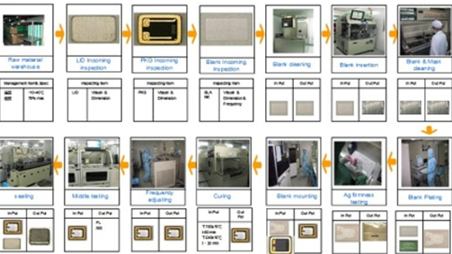 4.微調:使用真空鍍膜原理,將銀(金)鍍在芯片表面的銀(金)電極上,達到微調晶體諧振器的頻率達到規(guī)定要求.(插腳類產品產品較常使用)