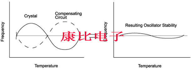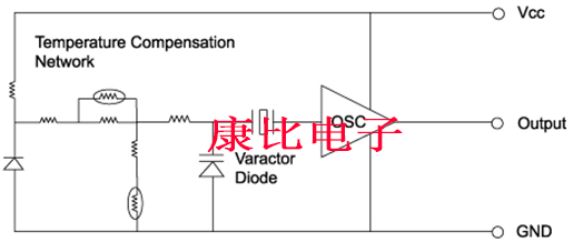 溫度穩定性使用標準補償技術,可以在-40℃至+85℃的溫度范圍內實現約±1ppm的分數穩定性.在較窄的溫度范圍內可以實現更好的穩定性.除了最簡單的TCXO晶振之外,所有技術都采用的實際技術是基于與晶振串聯使用的變容二極管,如下所示: 電壓的變化引起變容二極管的電容變化,導致振蕩頻率的變化.熱敏電阻網絡適用于晶體,使電壓隨溫度變化,從而補償晶體的頻率與溫度特性.由于每個TCXO要求其補償網絡與其單個晶體匹配,因此TCXO的成本與頻率與溫度規格的難度密切相關.