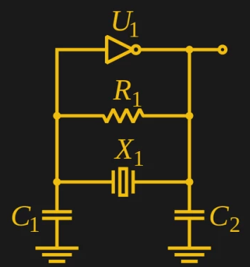 有許多晶體振蕩器配置,但如果使用數(shù)字電路,最可能遇到的電路是Pierce振蕩器.您會發(fā)現(xiàn)它是使用離散邏輯門以及眾多微處理器和其他IC實現(xiàn)的.晶體配置有一對電容器和一個高值偏置電阻器,作為從反相器輸出到輸入的相移網絡.其中一個電容器有時可以并聯(lián)一個小的可變電容器,允許進行非常小的頻率調整以校正各個晶體的容差.在晶體的共振頻率下,晶體上需要180度的相移以維持振蕩.