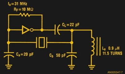 在實踐中,設計用于泛音的晶體將在其基頻的奇數(shù)倍處具有共振.因此,例如具有10MHz基頻的泛音晶振也將在30MHz和50MHz處具有泛音諧振. 在上面顯示的皮爾斯電路中放置一個泛音晶體不會導致它以泛音頻率振蕩,而是會在其基頻上運行.泛音振蕩器必須包含一個額外的調諧電路,用于抑制基頻,留下最突出的諧波諧振來決定振蕩頻率.在我們的CMOS振蕩器邏輯應用筆記示例中,逆變器輸出網絡中的電感執(zhí)行此任務.