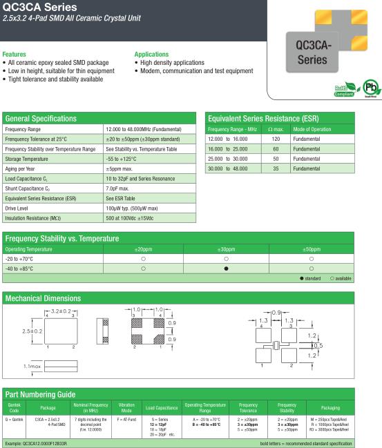 QANTEK晶振,QC3CA晶振,QC3CA12.0000F12B33R晶振,3225mm體積貼片晶振適用于汽車電子領域的表面貼片型石英晶振,本產品已被確定的高信賴性最適合用于汽車電子部件,晶體在極端嚴酷的環境條件下也能發揮穩定的起振特性,晶振本身具有耐熱,耐振,耐沖擊等優良的耐環境特性,滿足無鉛焊接的高溫回流溫度曲線要求,符合AEC-Q200標準.