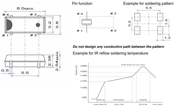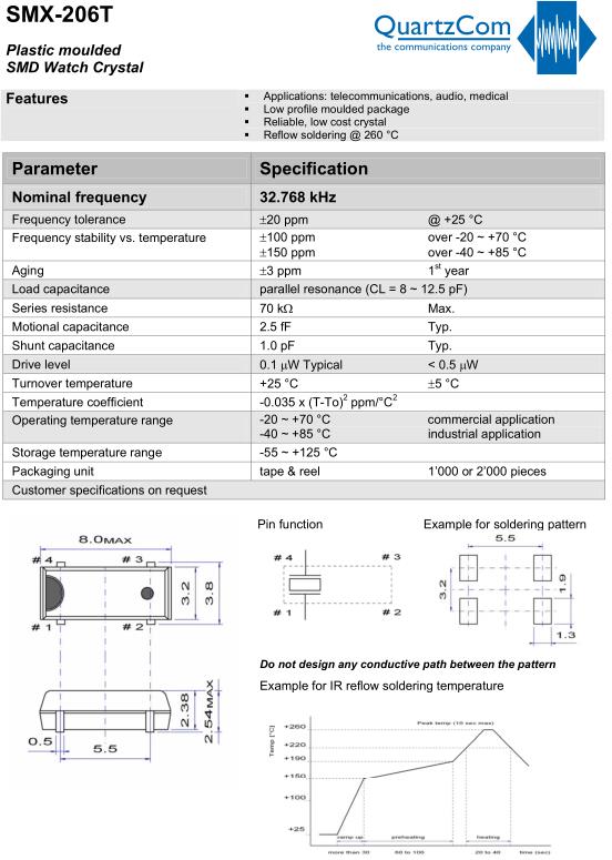 QuartzCom晶振,SMX-206T晶振,8038mm晶振,32.768K時鐘晶體具有小型,薄型,輕型的貼片晶振表面音叉型晶體振蕩器,產(chǎn)品具有優(yōu)良的耐熱性,耐環(huán)境特性,可發(fā)揮晶振優(yōu)良的電氣特性,符合RoHS規(guī)定,滿足無鉛焊接的高溫回流溫度曲線要求,金屬外殼的封裝使得產(chǎn)品在封裝時能發(fā)揮比陶瓷振蕩器外殼更好的耐沖擊性.