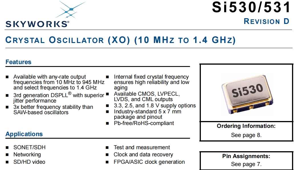 | 531BA48M0000DG | Skyworks有源晶振 | DIFFERENTIAL/SINGLE-ENDED; SINGL | Si531 | 48 MHz | LVDS |