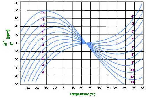 是以AT切割角度變動在厚度振動模態(tài)的頻率對溫度特性的展開圖. “1XXD38400HCA”,圖中以常用的室溫攝式25度作為相對零點, AT切割的最大優(yōu)點是頻率對溫度變化為一元三次方曲線. 這個特性, 從(如圖)中可以看到, 在相當寬廣的溫度范圍下, AT切割的溫度曲線的第一階及第二階常數為零, 第三階的常數便決定了頻率對溫度的變化值.