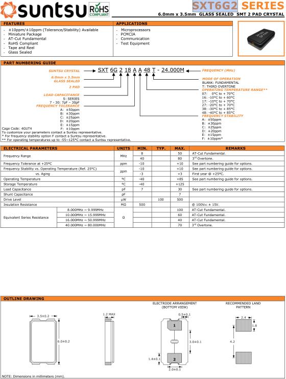 Suntsu晶振,SXT6G2晶振,SXT6G218AA48T-24.000M晶振,貼片晶振本身體積小,超薄型石英晶體振蕩器,特別適用于有目前高速發展的高端電子數碼產品,因為晶振本身小型化需求的市場領域,小型,薄型是對應陶瓷振蕩器(偏差大)和普通的石英晶體振蕩器(偏差小)的中間領域的一種性價比較出色的產品.產品廣泛用于筆記本電腦,無線電話,衛星導航SSD,USB,Blu-ray等用途,符合無鉛焊接的高溫回流焊曲線特性.