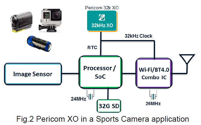 32.768K頻率也常用于手表狗的微處理器作為備用機制時鐘.換句話說,32.768 khz的存在時鐘在幾乎所有的應用程序是必需的.有兩種方法來生成這個32.768 khz的時鐘.第一個一個是使用32.768 khz音叉晶體(晶體)連接到ASIC或核心芯片.,另一個是使32.768 khz晶體振蕩器(XO)比晶體提供了更多的優勢.表1顯示了一個高水平比較32.768 khzXO和32.768 khz的音叉晶體.一個獨特的優勢,Pericom XO是同時開多個負載的能力.這是用于各種消費應用程序包括運動攝像機、智能手表,和其他這套.圖2顯示了一個運動鏡頭應用Pericom 32.768 khz的XO是用來驅動處理器和WiFi /藍牙芯片.
