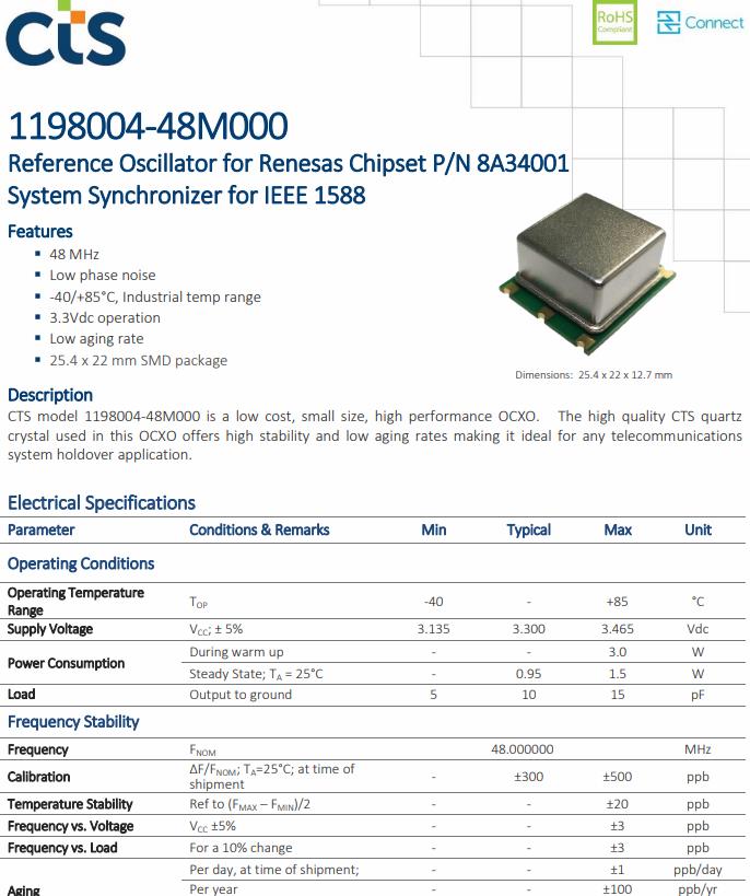 CTS model 1198004-48M000 is a low cost, small size, high performance OCXO. The high quality CTS quartz crystal used in this OCXO offers high stability and low aging rates making it ideal for any telecommunications system holdover application.