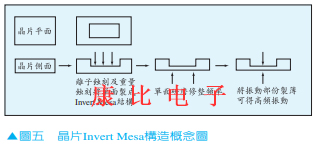 5.可以做到高頻化.ATCUT的振動(dòng)頻率由厚度決定,因此加工技術(shù)的進(jìn)步可以使厚度更薄,也能使振動(dòng)的石英晶體諧振器頻率提高.現(xiàn)在已經(jīng)知道基本波動(dòng)可以達(dá)到600MHz.由剛剛提到的厚度公式計(jì)算,可以得到約2.8µm.圖五為InvertMesa型高頻化概念圖.