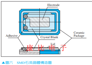 6.機(jī)械性強(qiáng)度優(yōu)異.由於ATCUT是厚度振動(dòng),因此晶片的外緣可堅(jiān)固地加以固定.外型與Bending在外緣部份會(huì)振動(dòng),因此晶片的中心部份(Node)須以細(xì)線支撐,要堅(jiān)固的加以固定是困難的.圖六為SMD石英晶體構(gòu)造圖.