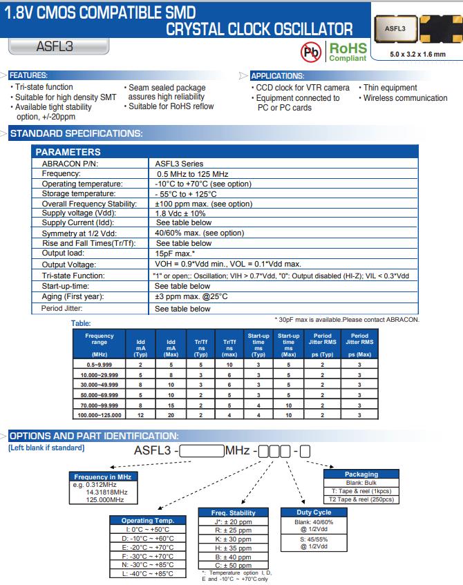 | ASFL3-32.000MHZ-EK-T | Abracon晶振 | ASFL3 | XO (Standard) | 32MHz | 1.8V | -20°C ~ 70°C |