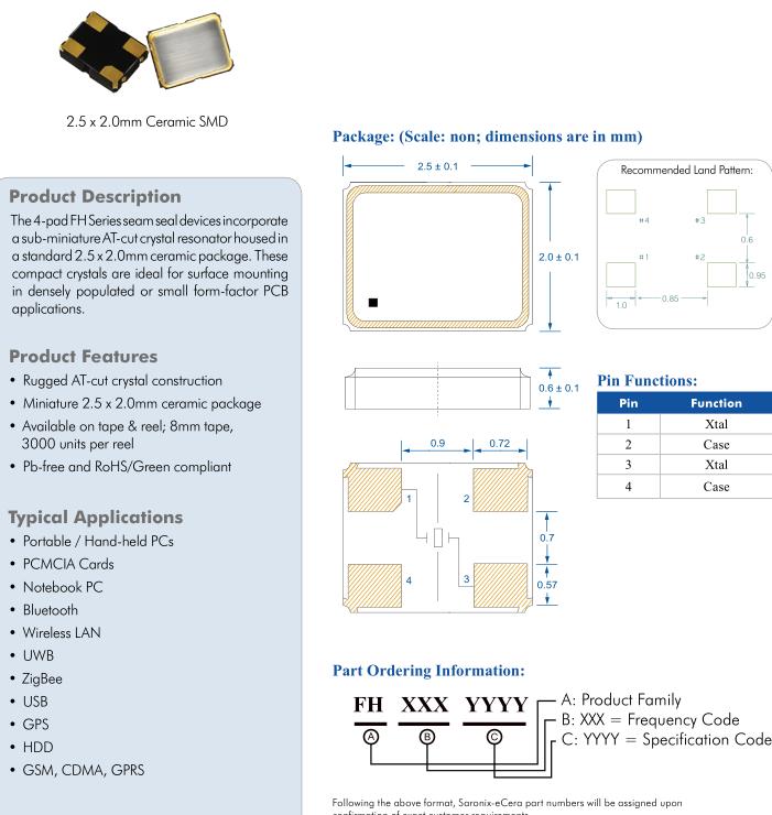 4-pad FH系列接縫密封裝置微型AT-cut石英晶體諧振器標(biāo)準(zhǔn)2.5 x 2.0mm陶瓷封裝。這些致密晶體是表面安裝的理想選擇在人口密集或小形狀因素PCB應(yīng)用程序。