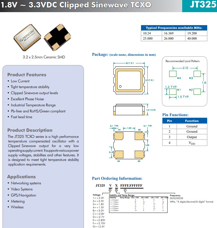 JT325系列是一款高性能溫度補償振蕩器(TCXO),溫補晶振,具有削波正弦波輸出,可實現非常低的工作電源電流。它支持各種電源電壓、穩定性和其他功能。它旨在滿足嚴格的溫度穩定性應用要求。
