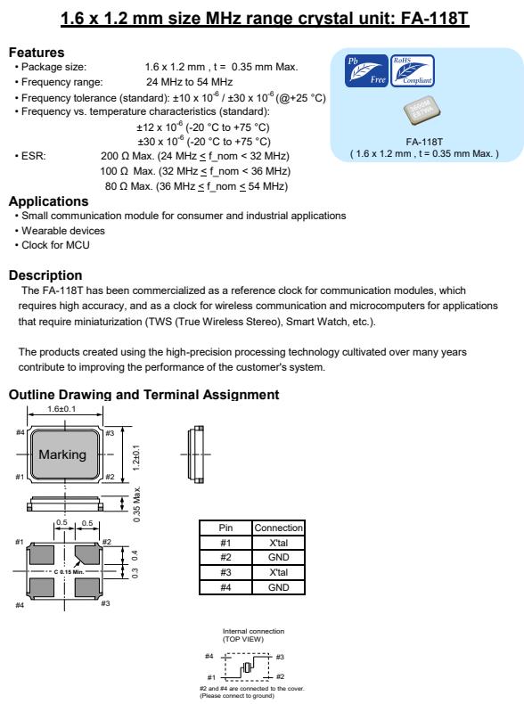 | X1E000251019000 | 1.6 x 1.2 x 0.35mm | FA-118T | 40.000000 MHz | 12 pF | +/-10 ppm |