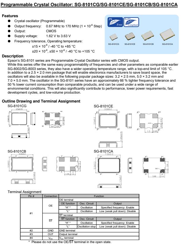 | X1G005191003100 | SG-8101CA | 10.000000 MHz | 7.00 x 5.00 x 1.40 mm | CMOS | 1.620 to 3.630 V | -40 to 105 °C |