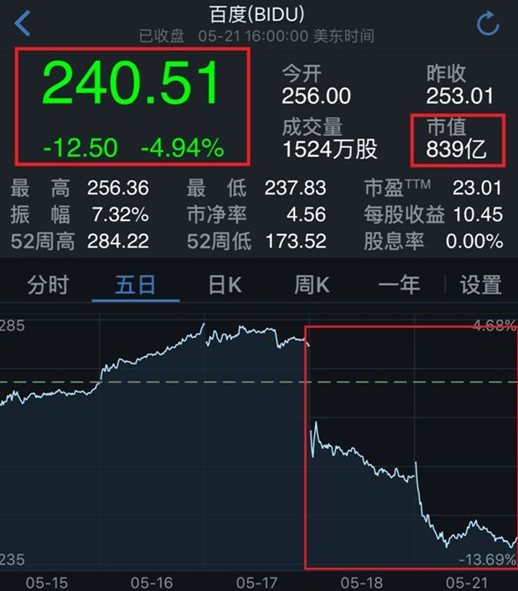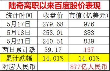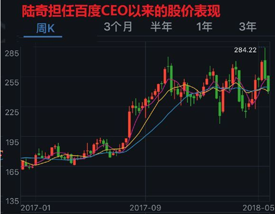 陸奇,百度集團總裁兼首席運營官,畢業(yè)于復旦大學,獲計算機科學學士、碩士學位。曾就讀于卡耐基梅隆大學,獲計算機科學博士學位。他除了在學術界發(fā)表過一系列高質量的研究論文,還持有40多項美國專利。 短短兩個交易日,百度的股價從279.68元,下跌到了240.51元,跌幅超過了14%。