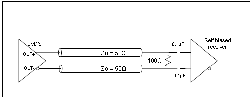 圖5:帶有內(nèi)部端接和偏置的LVDS驅(qū)動(dòng)器與自偏置差分接收器的連接