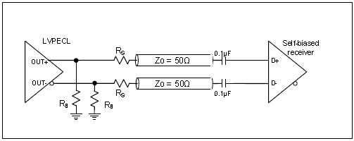 圖6:LVPECL驅(qū)動(dòng)器與帶內(nèi)部端接和偏置的自偏置差分接收器的連接.