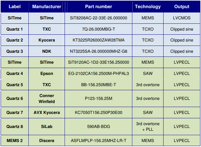 表2測試中的振蕩器設(shè)備;單端部分(藍(lán)色陰影部分)工作在26兆赫,差分部分(綠色陰影部分)工作在156.25兆赫