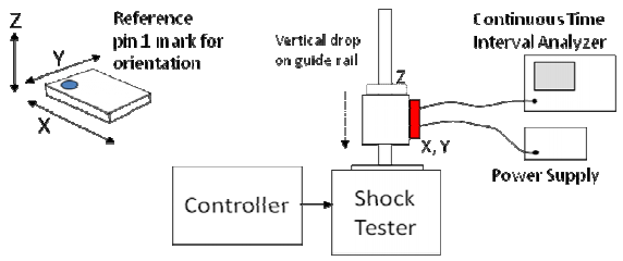 方法2002標(biāo)準(zhǔn)MIL-STD-883H[2]被廣泛用于測試非工作模式下機械沖擊下石英晶體振蕩器的生存能力.大多數(shù)市售石英晶體振蕩器在環(huán)境鑒定試驗中規(guī)定了100-g至1500-g的等級,而SiTime微機電系統(tǒng)振蕩器在10,000-g至50,000-g的機械沖擊下達(dá)到了環(huán)境鑒定.沖擊測試設(shè)置如圖4和5所示.與振動測試方法相似,我們將振蕩器定向為在x,y和z方向施加沖擊,并測量最壞的情況.連續(xù)10秒每100秒進行一次頻率測量,提供沖擊前,沖擊中和沖擊后的頻率響應(yīng)數(shù)據(jù).