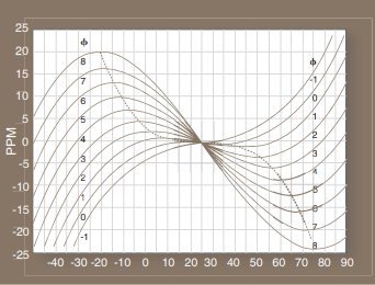 其中A0至a5是要生成的多項式的系數,T是當前溫度,Ti是晶體的拐點溫度(晶體曲線相對于上下轉折點居中的溫度,通常在+26°C左右).