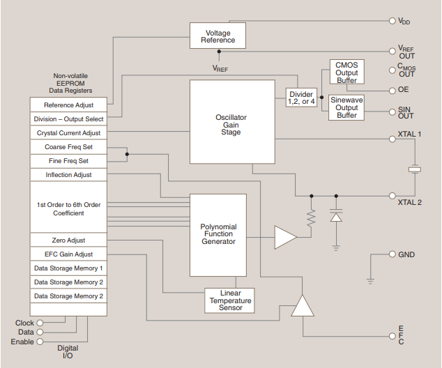 校準變量的調整范圍,以覆蓋AT切割晶振隨溫度變化的角度.所有溫度都參考晶體拐點溫度.系數值作為數字存儲在芯片上的非易失性寄存器中.雖然理想的AT晶體應該遵循三階曲線,但電路和晶體中的非線性要求包含高階項,以便獲得與所需補償電壓曲線的匹配.晶體拐點溫度在匹配曲線時很重要,并且是必須可編程的變量之一,以便使用更大范圍的晶體.一些小型帶狀晶體可能具有高達40°C的彎曲,這可能會使精確的曲線擬合變得困難.
