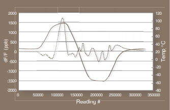 顯示了回轉溫度運行期間的20MHz振蕩器.紅色曲線顯示右側y軸上的腔室溫度4,藍色曲線是左側y軸上的振蕩器頻率.x軸將時間繪制為