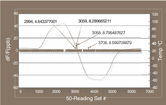 為了獲得最大的信心,當溫度從一個極端上升到另一個極端并返回時,每個振蕩器的頻率應該被持續監控.這種類型的測試保證了存在的任何擾動或微跳躍都將被捕獲.圖5顯示了20MHzTCXO的篩選結果,該結果在8°C/分鐘斜坡曲線期間被監控.在整個時間內,輸出頻率每秒連續記錄50次,讀數之間沒有停滯時間.藍線是連續讀數之間的差異圖,它突出顯示了任何瞬時跳躍.這種AT帶晶體在整個測試過程中沒有顯示出任何擾動和一些微小的跳躍,這表明TCXO具有卓越的性能.