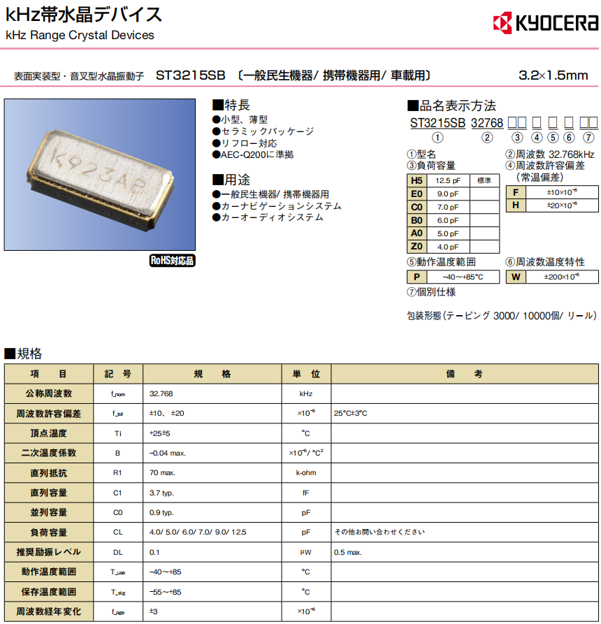 | ST3215SB32768E0HPWZZ | Kyocera晶振 | ST3215SB | 32.768kHz | -40°C ~ 85°C | 2-SMD, No Lead |