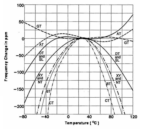 大部份的石英晶體產(chǎn)品"7Q-24.000MBN-T"是用于電子線(xiàn)路上的參考頻率基準(zhǔn)或頻率控制組件, 所以, 頻率與工作環(huán)境溫度的特性是一個(gè)很重要的參數(shù). 事實(shí)上, 良好的頻率與溫度(frequeny versus temperature)特性也是選用石英做為頻率組件的主要因素之一. 經(jīng)由適當(dāng)?shù)亩x及設(shè)計(jì), 石英晶體組件可以很容易的就滿(mǎn)足到以百萬(wàn)分之一 (parts per million, ppm) 單位等級(jí)的頻率誤差范圍. 若以離散電路方式將LCR零件組成高頻振蕩線(xiàn)路, 雖然也可以在小量生產(chǎn)規(guī)模達(dá)到所需要的參考頻率信號(hào)誤差在ppm或sub-ppm等級(jí)要求, 可是這種方式無(wú)法滿(mǎn)足產(chǎn)業(yè)要達(dá)到的量產(chǎn)規(guī)模. 石英組件的頻率對(duì)溫度特性更是離散振蕩線(xiàn)路無(wú)法簡(jiǎn)易達(dá)成的. 在(圖四) 中提供了數(shù)種不同的石英晶體切割角度的頻率對(duì)溫度特性曲線(xiàn).