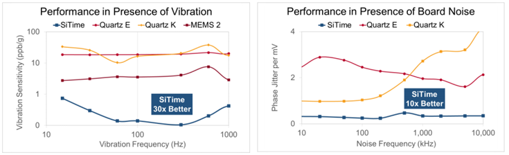 在包括正弦振動(dòng)和隨機(jī)振動(dòng)在內(nèi)的各種條件下,使用標(biāo)準(zhǔn)化的測試方法具有相似的規(guī)格.如圖6和7所示,SiTime的基于記憶的振蕩器表現(xiàn)出出色的抗振動(dòng)和電路板噪聲能力.閱讀更多關(guān)于測試的信息