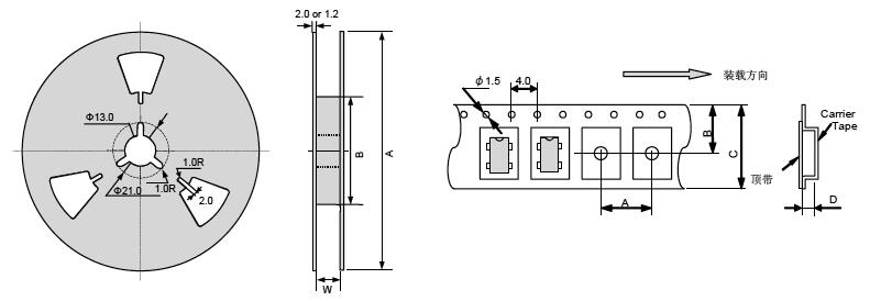 3、SMD式:將SMD 產品包裝在紙箱里以便裝運,如下表所述;符合磁帶標準EIA-481 和 IEC-60286.