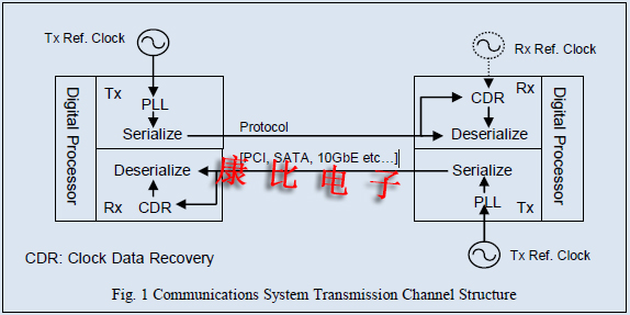 圖1顯示了一個典型的通信系統(傳輸信道),其中兩個收發器之間的數據轉發由多種協議(PCI,SATA,10GbE等)介導.).在這種類型的系統中,有源晶振振蕩器用于產生參考時鐘.通常,數據在發送方被參考信號串行化,以說明參考信號以低于數據速率的頻率振蕩.因此,發射器的內部鎖相環(鎖相環)用于將參考信號乘以所需頻率,并傳輸數據.相反,在接收端,基于鎖相環的時鐘數據恢復(CDR)用于從傳輸的數據流中再生參考信號,然后再生的參考信號用于重構數據.在一些高端系統中,接收端具有用于數據重建的嵌入式參考信號.利用這種數據傳輸,信號轉換和再生是永久進行的,并且利用高速通信,接收端必須準確地將發送的數據識別為0和1.因此,如何限制實際信號的退化水平(抖動,噪聲),提高信號質量以及如何有效地設計傳輸信道專用集成電路成為至關重要的問題. [信號質量評估方法]