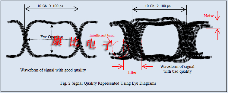 獲得足夠的孔徑.如果眼睛睜開是由于噪聲或抖動而收縮的,則接收端信號數據識別不明確,并導致較高的誤碼率.目前,幾乎所有的通信系統都要求誤碼率至少為1x10-12.這意味著對于每個數據傳輸位,相對于1012個數據量的一個誤差是容許的.如上所述,眼圖提供了大量與信號質量相關的信息,如噪聲,抖動和頻帶不足.