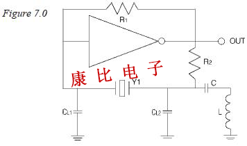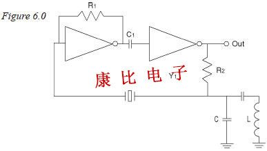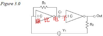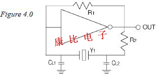 電阻器R1和R2具有與圖3.0所示串聯(lián)諧振電路相同的功能.兩個負(fù)載電容CL1和CL2用于確定晶體單元以及振蕩器的工作頻率.晶體單元Y1是并聯(lián)諧振晶體單元,被指定以負(fù)載電容的指定值,期望的頻率以及期望的頻率容限和穩(wěn)定性工作.