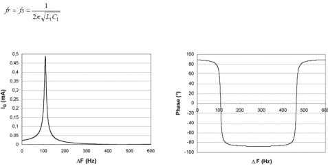 圖9顯示了幅度和相位與石英晶振周圍頻率的響應(yīng)。共振頻率由下式給出: