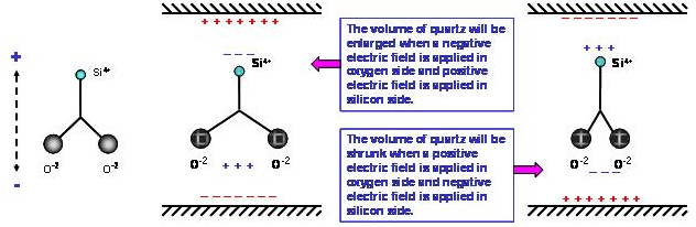 “1C210000EE0M”石英材料中的二氧化硅分子(SiO2) 在正常狀態下, 其電偶極是互相平衡的電中性. 在(如圖)的二氧化硅是以二維空間的簡化圖形. 當我們在硅原子上方及氧原子下方分別給予正電場及負電場時, 空間系統為了維持電位平衡, 兩個氧原子會相互排斥, 在氧原子下方形成一個感應正電場區域, 同時在硅原子上方產生感應負電場區域. 相反的情況, 當我們在硅原子上方及氧原子下方分別給予負電場及正電場時, 兩個氧原子會相互靠近, 氧原子下方產生感應負電場,硅原子上方產生感應正電場.